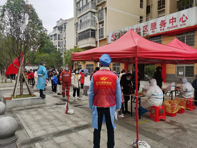 12月3日,萬寶投資集團黨員志愿者在盛世嘉園小區(qū)核酸檢測現(xiàn)場幫助社區(qū)工作人員開展場所碼登記、秩序維護等工作。